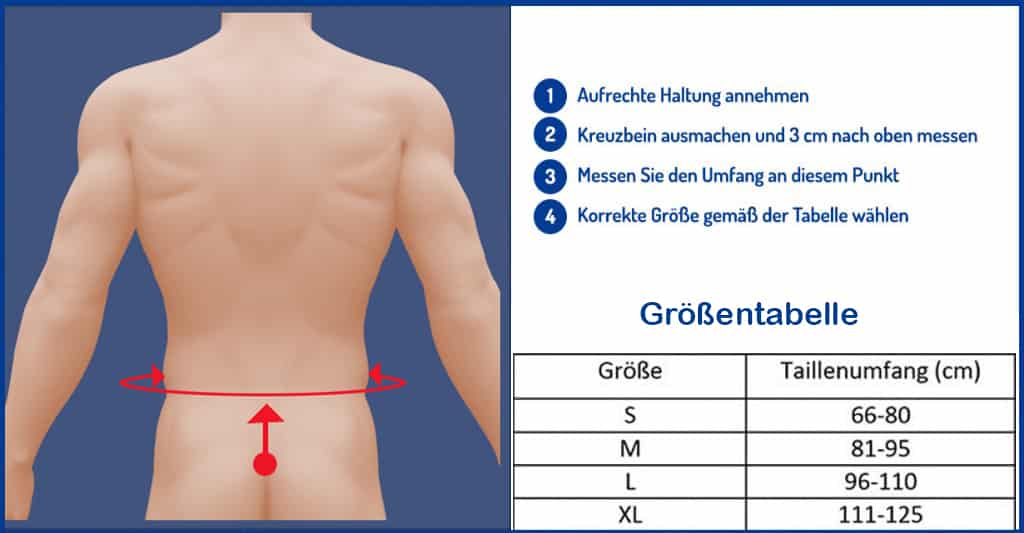 Achtung! Für eine korrekte Funktion ist es wichtig, dass die Bandage die Lendenwirbelsäule fest umschließt und während der Belastung in der Position bleibt.