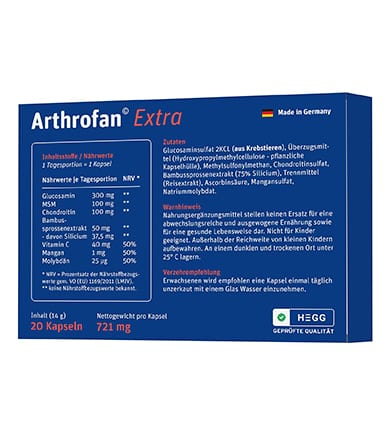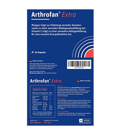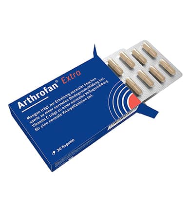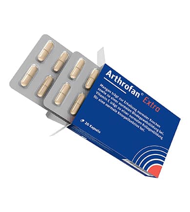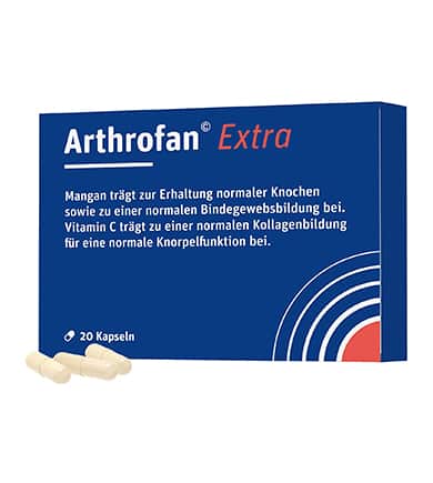 Arthrofan ist ein innovativer Zutatenkomplex für Ihre Gelenke. Vitamin C trägt dabei zu einer normalen Kollagenbildung für eine normale Knorpelfunktion bei (Verordnung EG Nr.1924/2006 Health Claims der Europäischen Union).